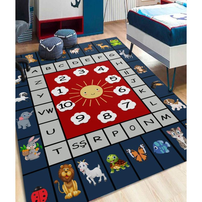 Covor Educativ Copii Model Alfabet Animale si Numere, Antiderapant, 80x 150cm