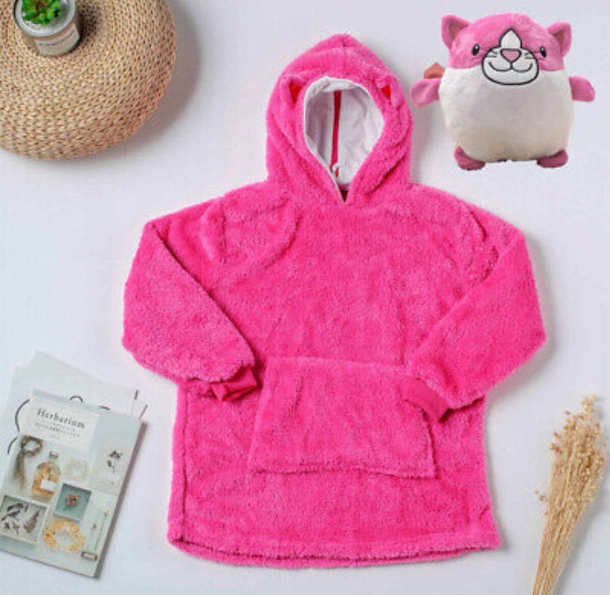 Avem 4 personaje diferite de animale de pluș (cățeluș albastru, unicorn curcubeu, dinozaur verde, pisicuță roz, ) din care să alegeți cu Hanoracul. Desfaceți fermoarul acestor creaturi drăguțe umplute și ele se desfășoară într-un hanorac cu glugă cu aspect grozav și colorat.