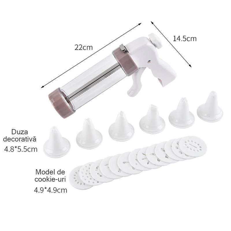 - Dimensiunea aparatului pentru decorarea cookie-urilor: 22 x 14,5 x 5,5 cm (LxLxH).