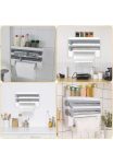 Cu acest suport veti avea la indemana rola de hartie pentru bucatarie, folia alimentara si cea de aluminiu. Lamele ascutite din metal ale suportului vor taia eficient foliile avand si rol de capac.